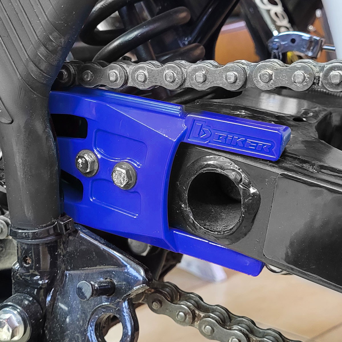 Fabricado en polímero de alta resistencia a la abrasión que genera la cadena de la motocicleta.