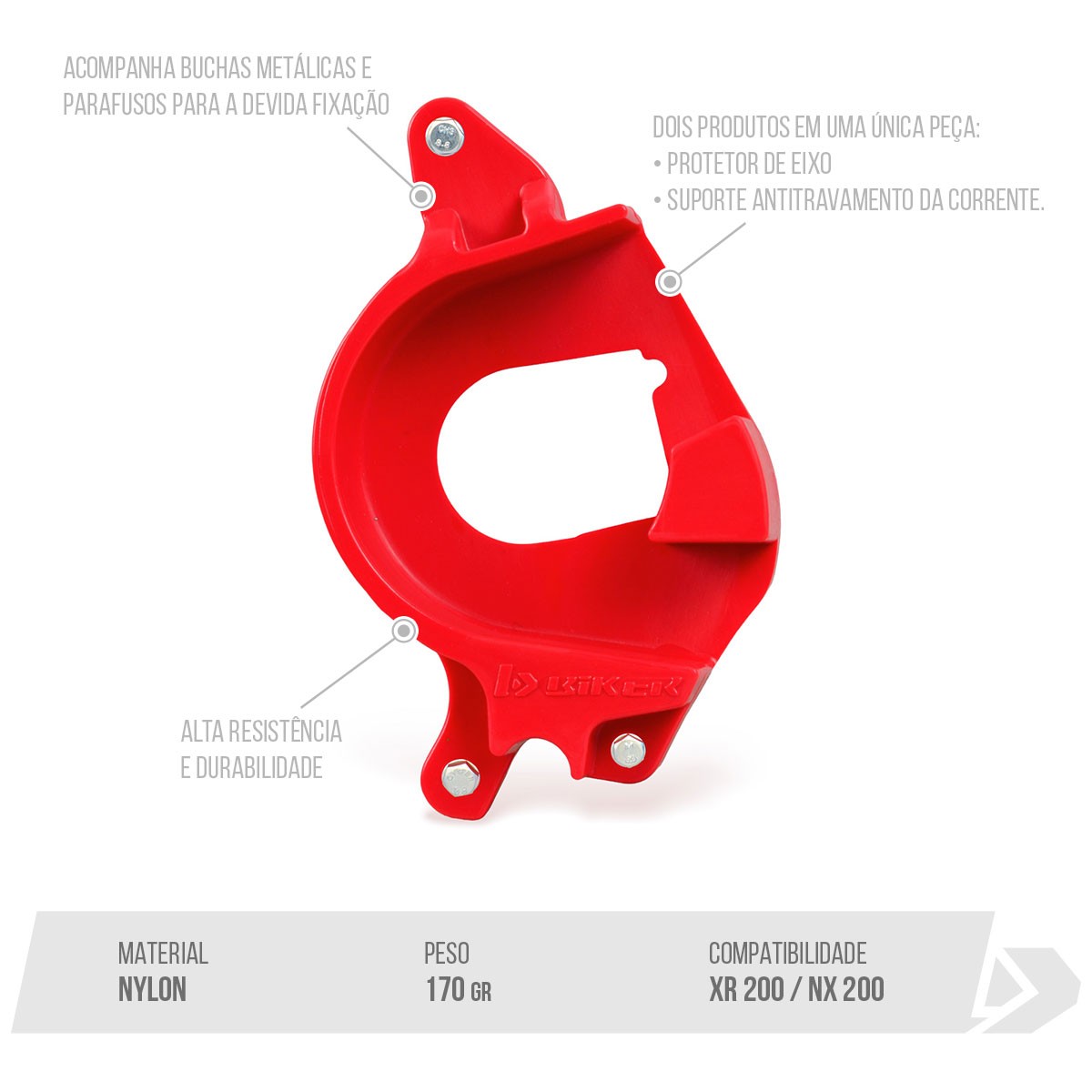 Dois produtos em uma única peça: Protetor de Eixo e Suporte Antitravamento da corrente.