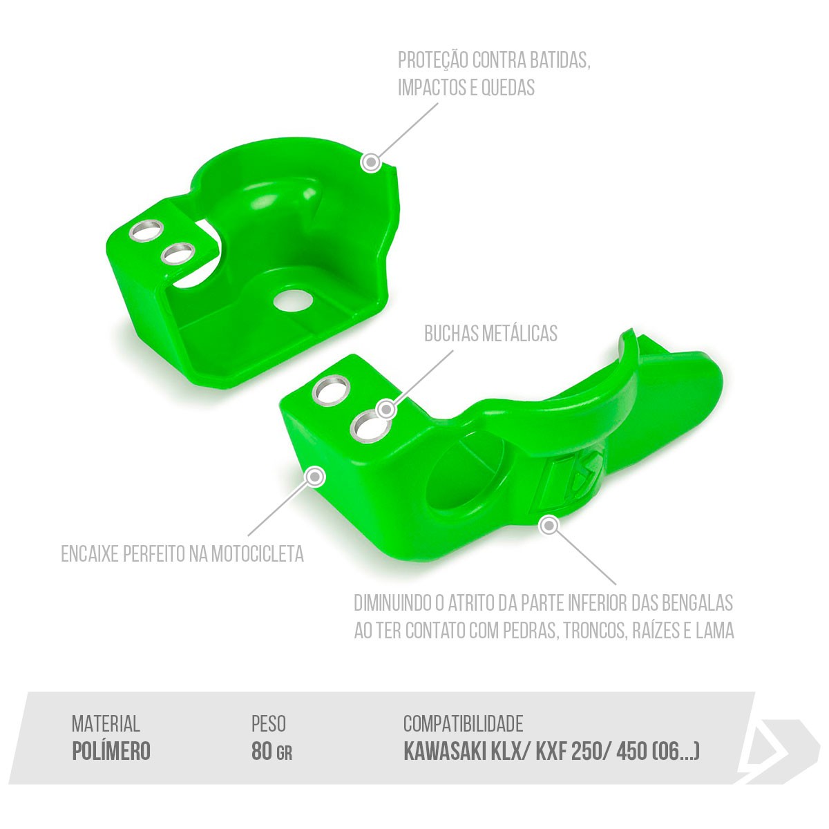 Proteção ideal para a prática do Off Road contra batidas, impactos e quedas, diminuindo o atrito da parte inferior das bengalas ao ter contato com pedras, troncos, raízes e lama. Produzidos em polímero de alta resistência aos impactos. Encaixe perfeito na motocicleta. Buchas metálicas.