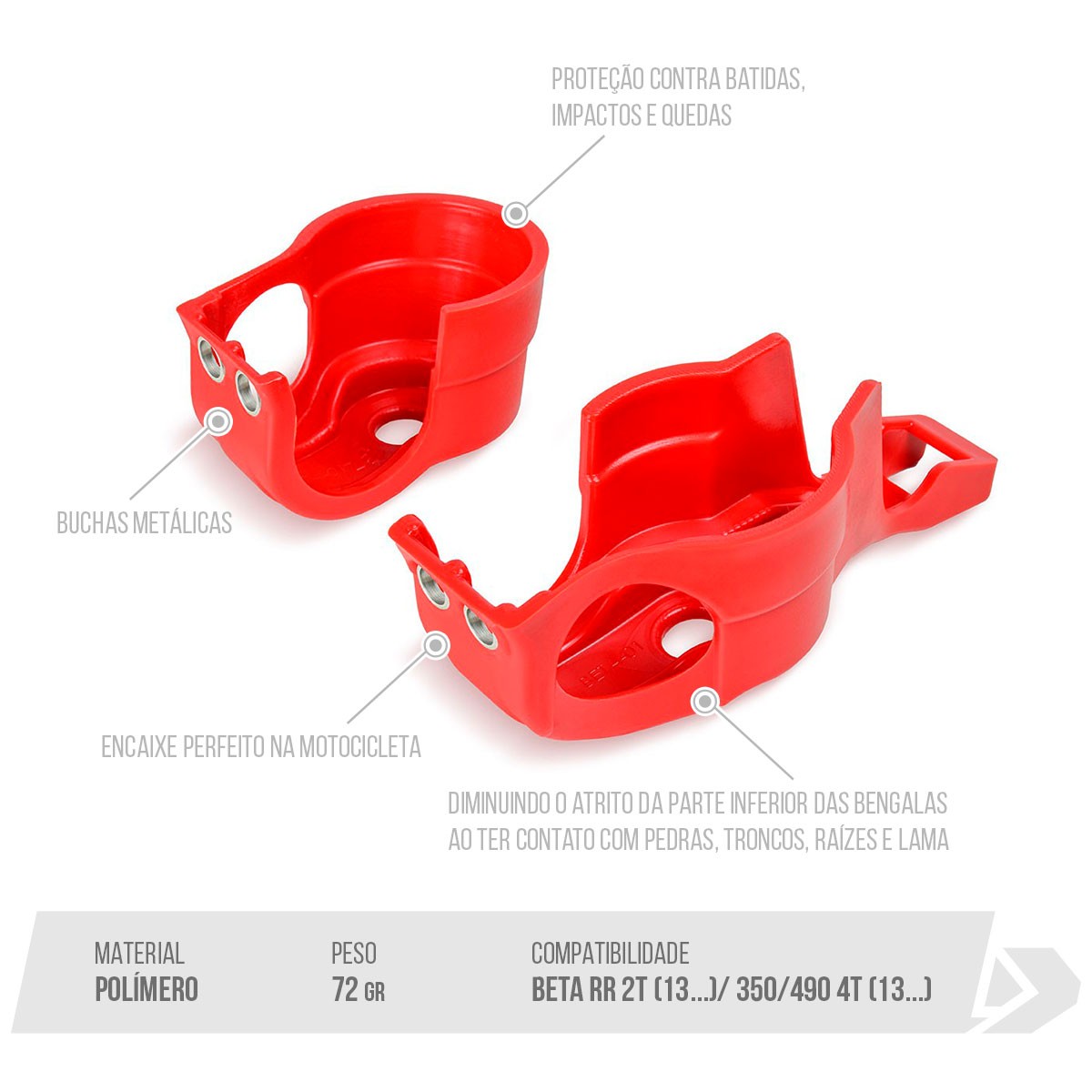 Proteção ideal para a prática do Off Road contra batidas, impactos e quedas, diminuindo o atrito da parte inferior das bengalas ao ter contato com pedras, troncos, raízes e lama. Produzidos em polímero de alta resistência aos impactos. Encaixe perfeito na motocicleta. Buchas metálicas.