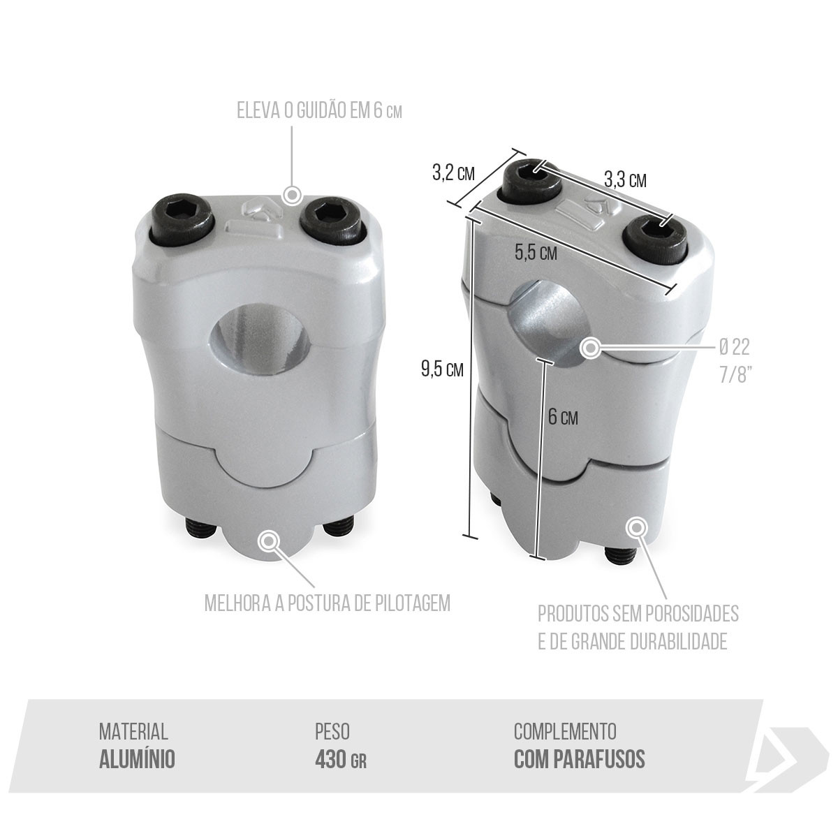 Adaptadores + Base Alongadora possuem medidas Ø22 X 60mm tem por função elevar o guidão em 60 mm.