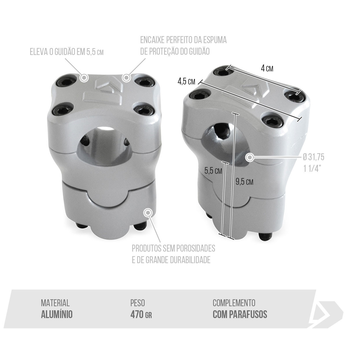Adaptadores + Base Alongadora possuem medidas Ø31.75 X 58mm tem por função elevar o guidão em 5,5 cm.