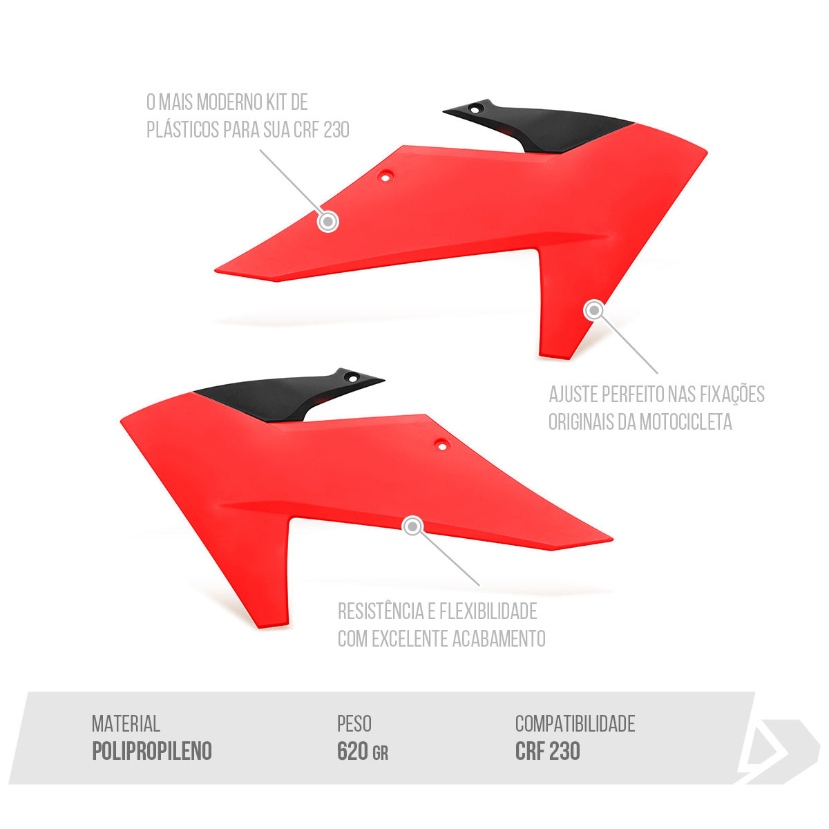 Plásticos moldados por injeção, com ajuste perfeito nas fixações originais da motocicleta.