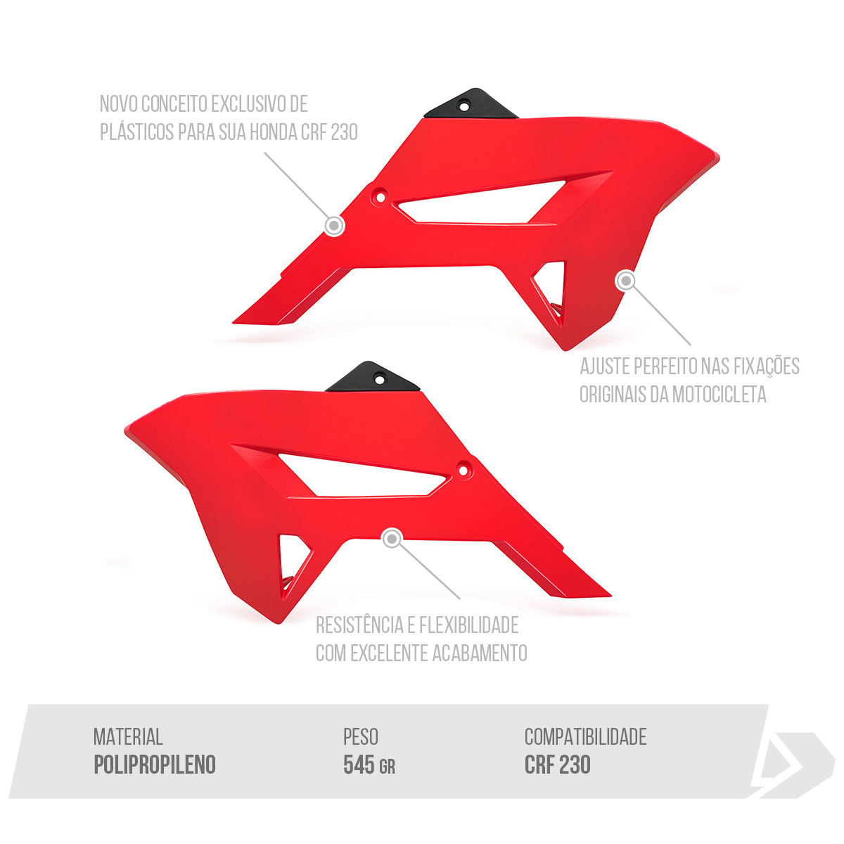 Plásticos moldados por injeção, com ajuste perfeito nas fixações originais da motocicleta.