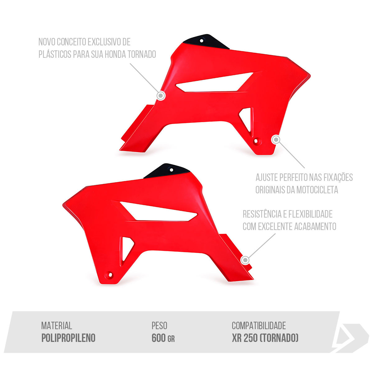 Plásticos moldados por injeção, com ajuste perfeito nas fixações originais da motocicleta.