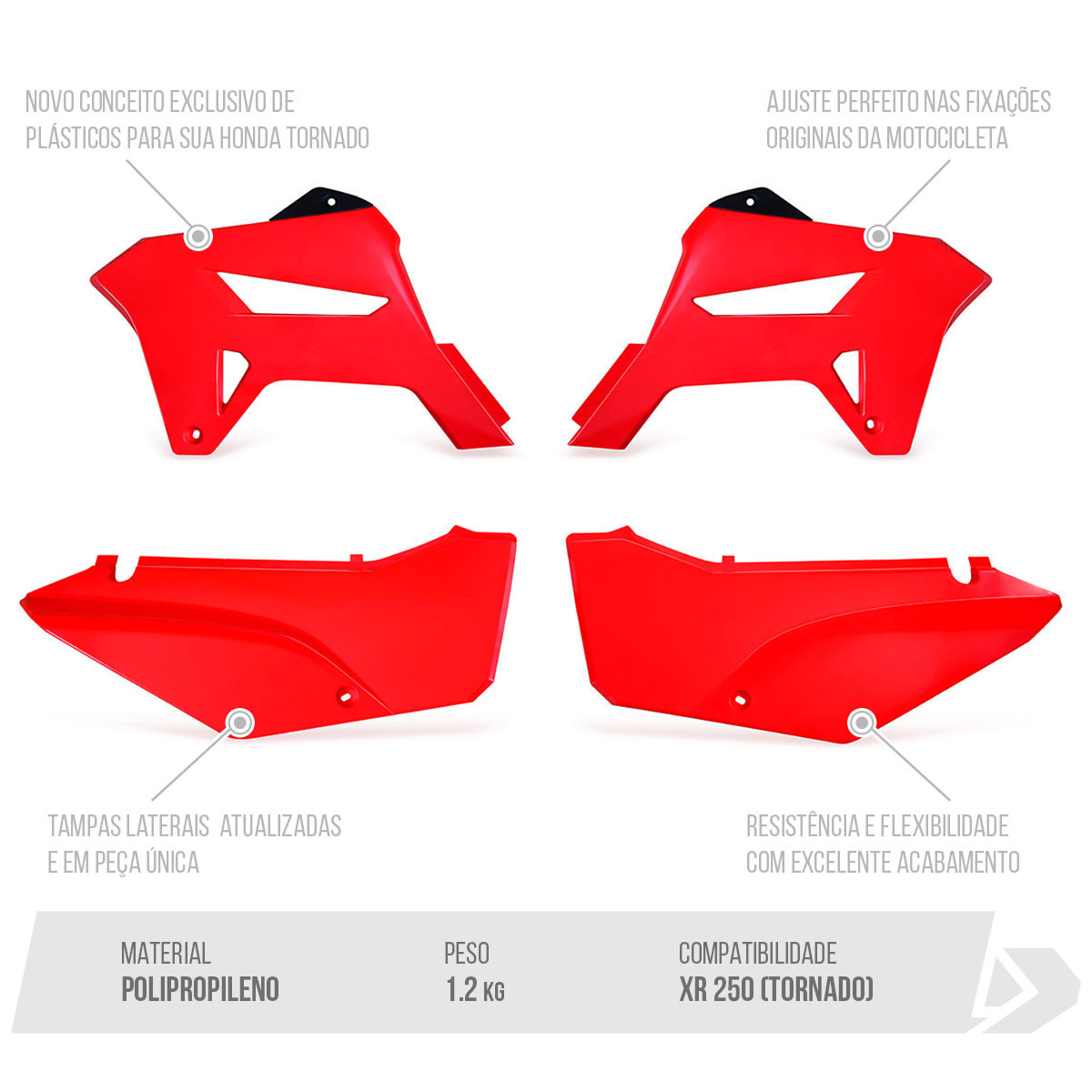 Plásticos moldados por injeção, com ajuste perfeito nas fixações originais da motocicleta.