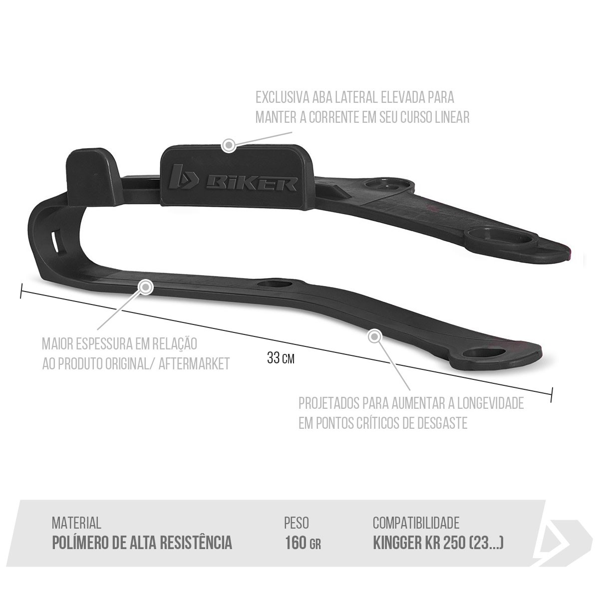 Fabricados em polímero de alta resistência a abrasão gerada pela corrente da motocicleta.