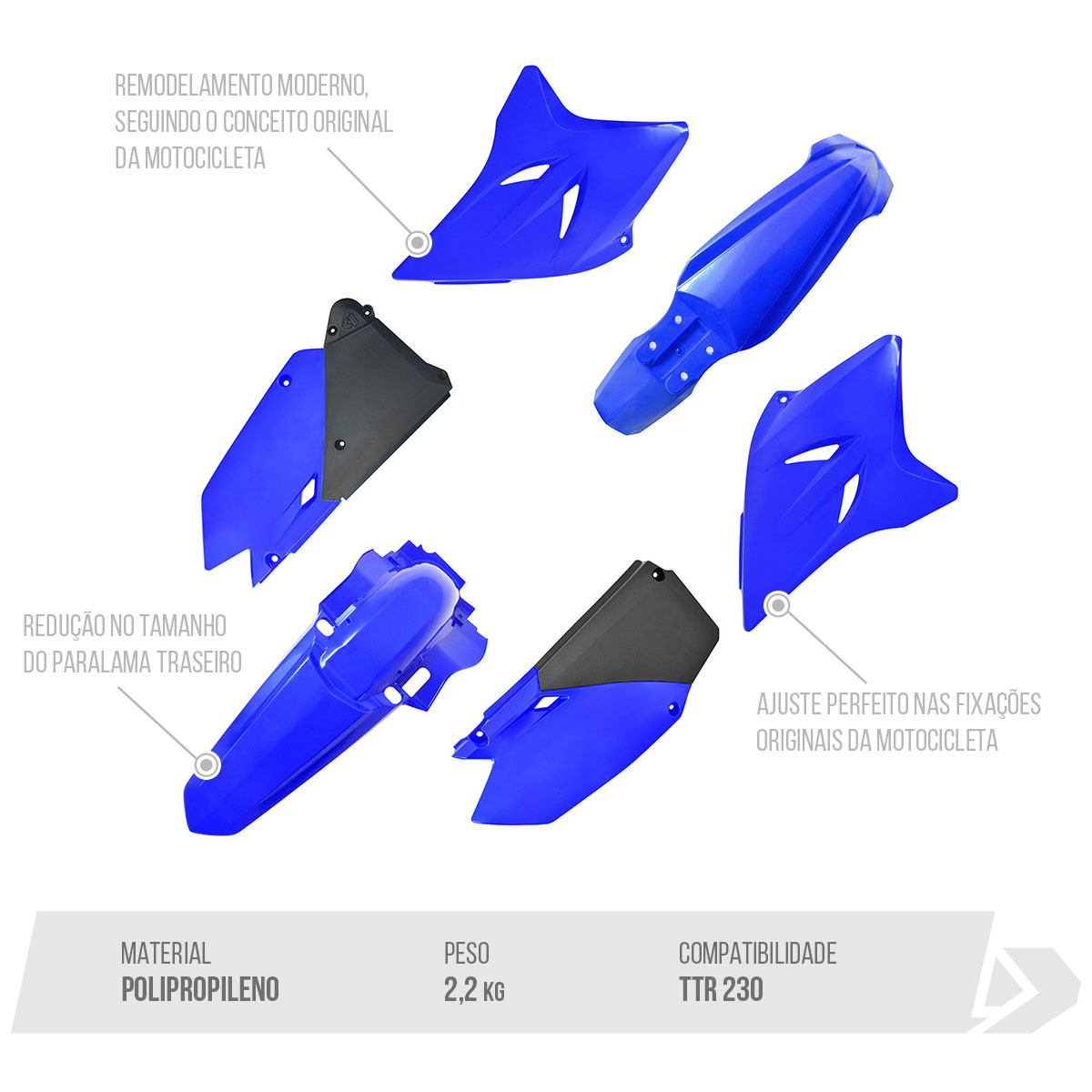 Plásticos moldados por injeção, com ajuste perfeito nas fixações originais da motocicleta.