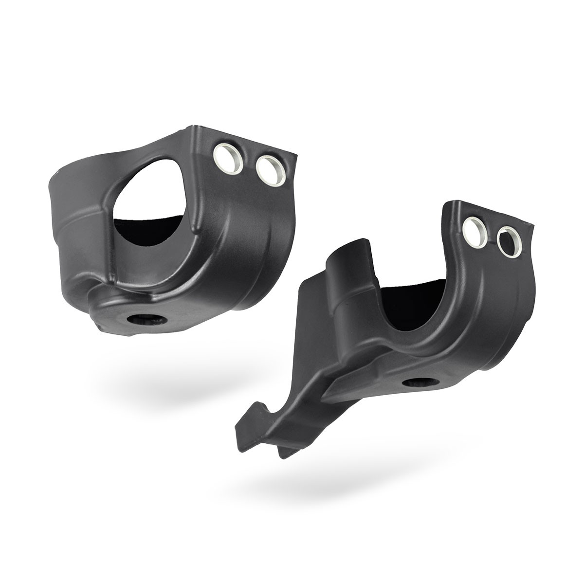 Proteção ideal para a prática do Off Road contra batidas, impactos e quedas, diminuindo o atrito da parte inferior das bengalas ao ter contato com pedras, troncos, raízes e lama. Produzidos em polímero de alta resistência aos impactos. Encaixe perfeito na motocicleta. Buchas metálicas.