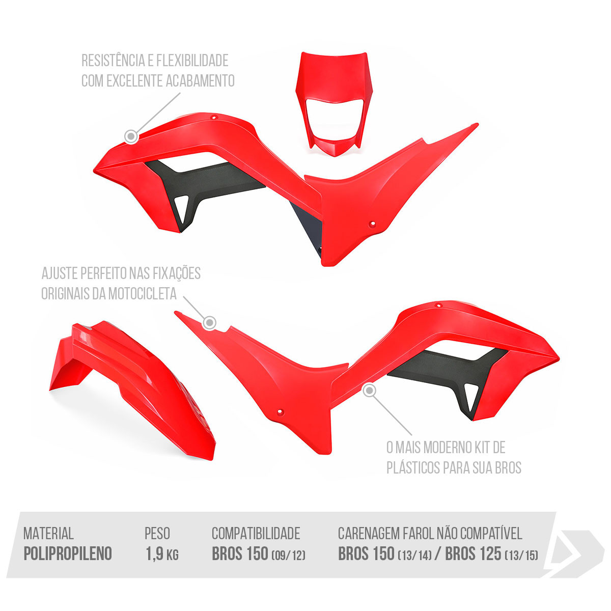 Moderno e conceitual Reestyle Kit, assim podemos definir os novos plásticos compatíveis para as motocicletas Bros 150 (09/12). Mantendo encaixes perfeitos, acabamento em alto brilho, moldados em polímero flexíveis e resistentes.