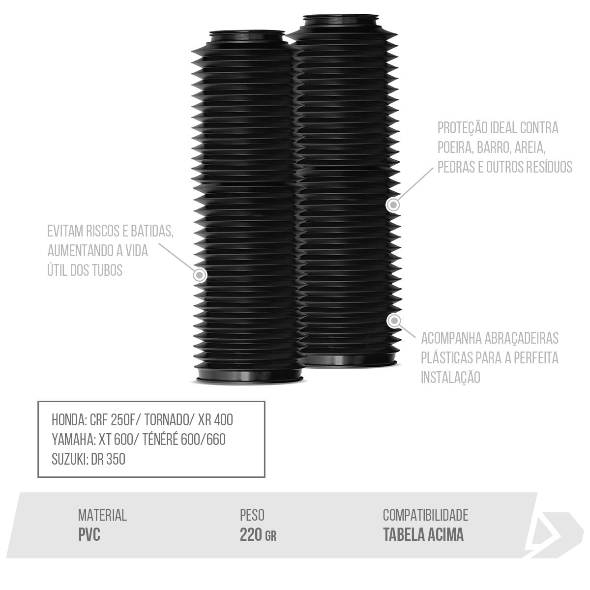 | Modelos Compatíveis | CRF 250F/ CRF 300F/ TORNADO (XR 250)/ XR 400/ XT 600/ TÉNÉRÉ 600/660/ DR 350 |