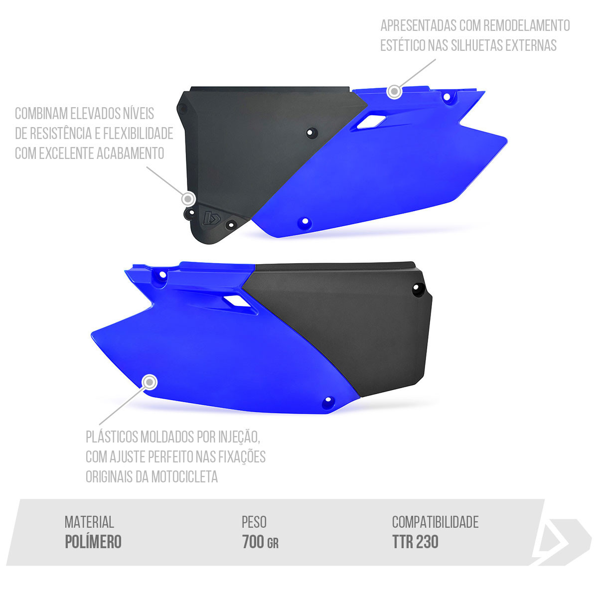 Plásticos moldados por injeção, com ajuste perfeito nas fixações originais da motocicleta.
